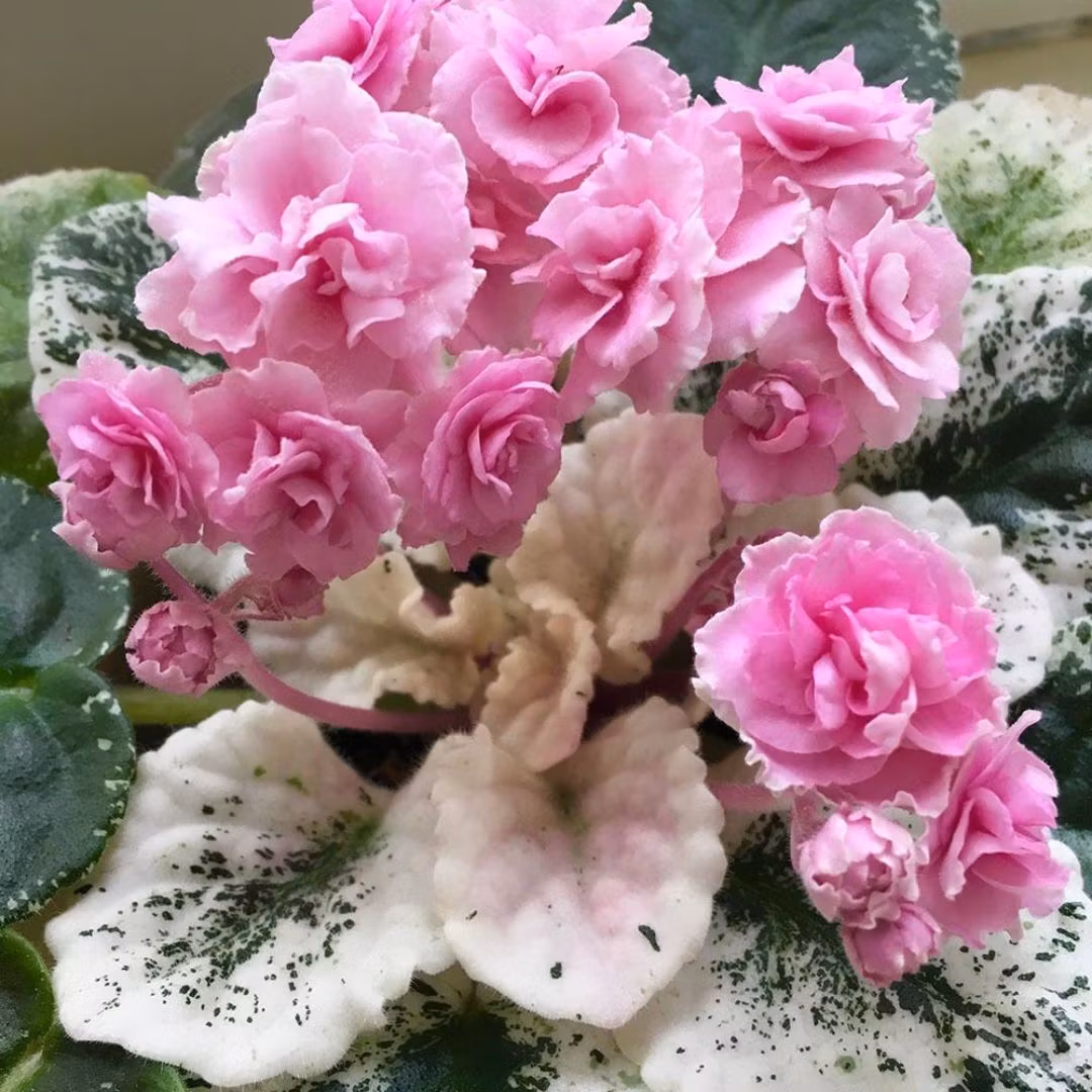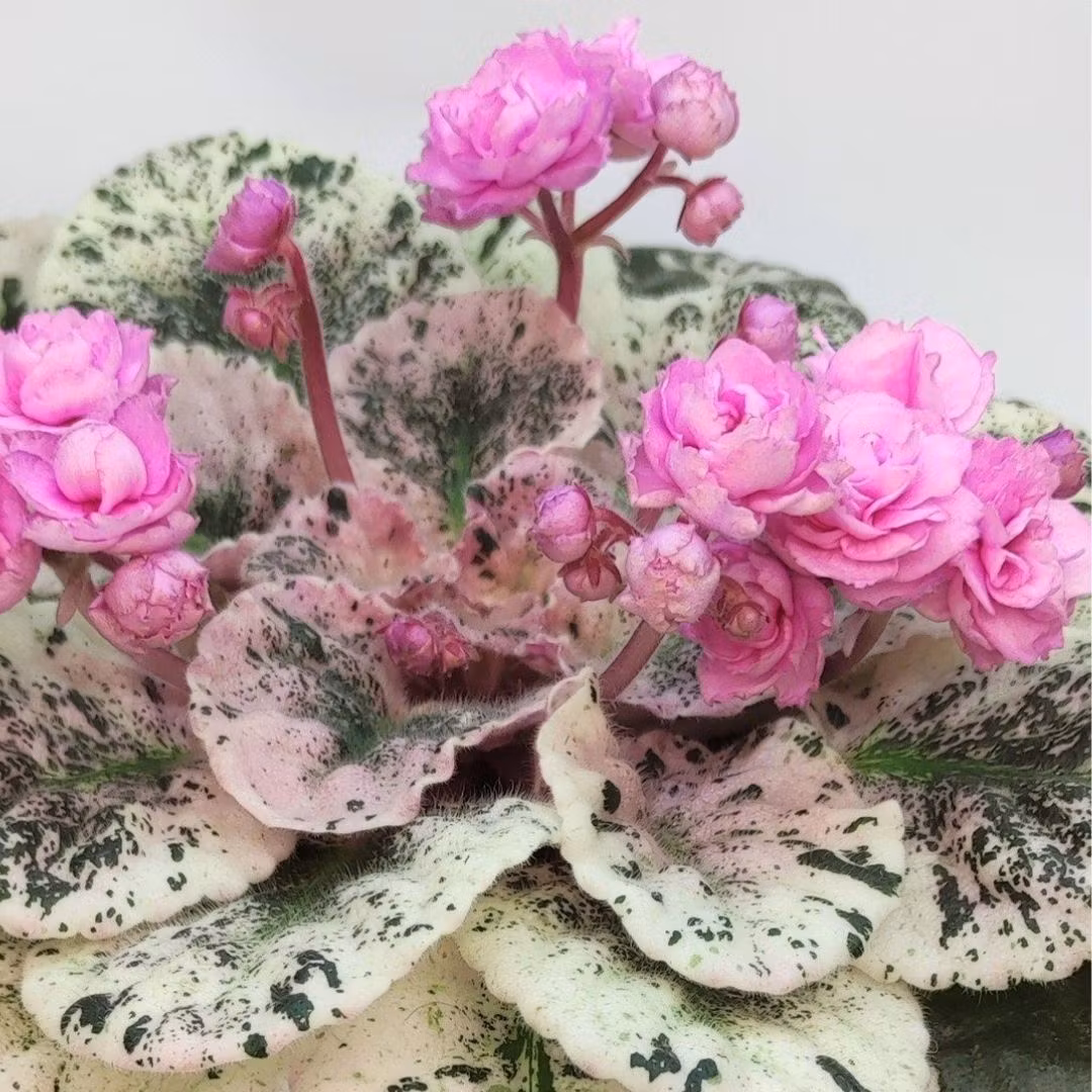 Saintpaulia ’Rose Bouquet’ bjuder på ett överflöd av dubbla, rosatonade blommor som liknar små rosor – tätt samlade ovanför de sammetslena, mörkgröna bladen. De